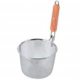 取っ手の後ろに鍋の縁に引っ掛けられるフックが付いていますので、ザルが傾いて麺が鍋にこぼれる事はありません。フックの長さが短いのでザルの半分位までの深さまでにしかなりません。(ザルに入れる麺の量にもよりますが、たっぷりとお湯につかる感じではないという事です。)編み目が大きめなので水切りはいいです。